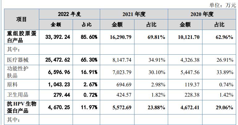 其中,主营业务为以重组胶原蛋白产品和抗HPV生物蛋白产品为核心的各类医疗器械、功能性护肤品的研发、生产及销售。