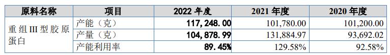招股书透露,报告期内,重组Ⅲ型胶原蛋白的产能利用率分别为92.58%、129.58%和 89.45%。2021年新增用于生产三类医疗器械的胶原蛋白原料产线,产能有所上升。2022年,对现有工艺进行升级以及新增投入部分原料生产设备,原料产能进一步有所上升。