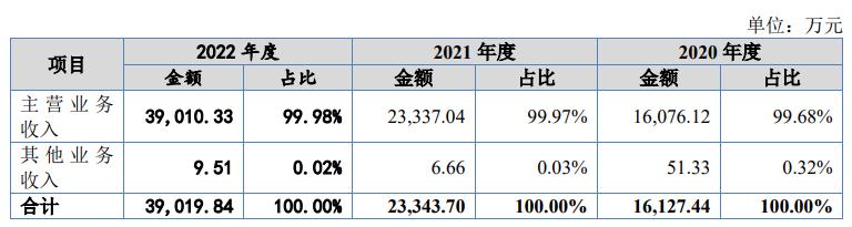从业务板块来看,招股书透露,报告期内,2020年度-2022年度,公司主营业务收入分别为16,076.12万元、23,337.04万元、39,010.33万元,占营业收入比例分别为99.68%、99.97%、99.98%。主营业务收入来源于医疗器械、功能性护肤品、卫生用品以及原料的销售。