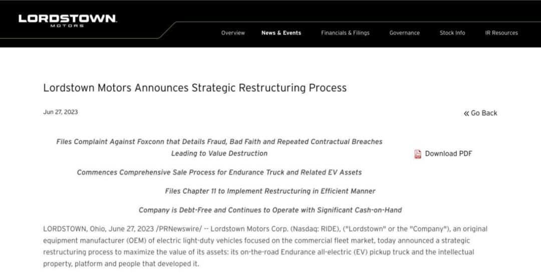 本周,美国电动汽车上市公司——洛兹敦汽车(Lordstown Motors)在官网上宣布,已向美国特拉华州破产法院申请启动破产重组程序。至此,又一个造车新势力倒下。