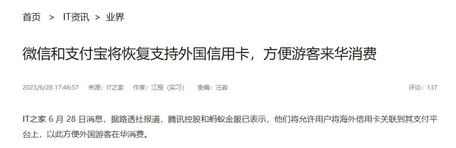 最近有消息报道,微信和支付宝将恢复支持外国信用卡,方便外国游客来华消费。