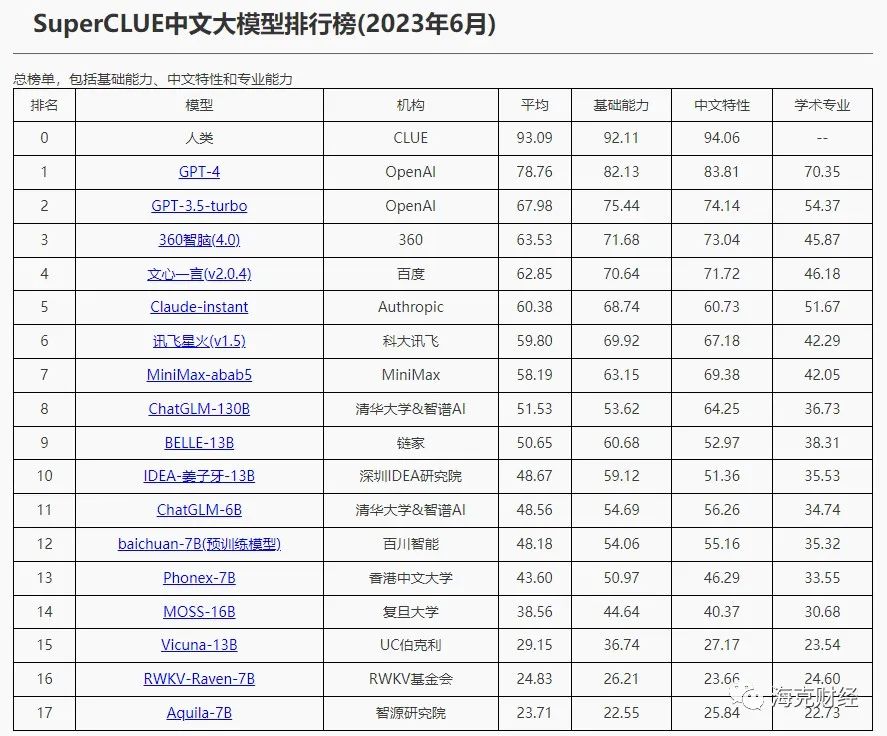 榜单发布当日,SuperCLUE官网显示,中文基准测评成员顾问排名第一位的是哈工大讯飞联合实验室资深级研究员崔一鸣。第二天即5月10日,网站就删除了相关信息。而在2023年6月的中文大模型排行榜中,该机构将人类排在0位,第一、二位仍是ChatGPT,三、四位则变成了360智脑(4.0)和文心一言(v2.0.4),讯飞星火(v1.5)排至第六。