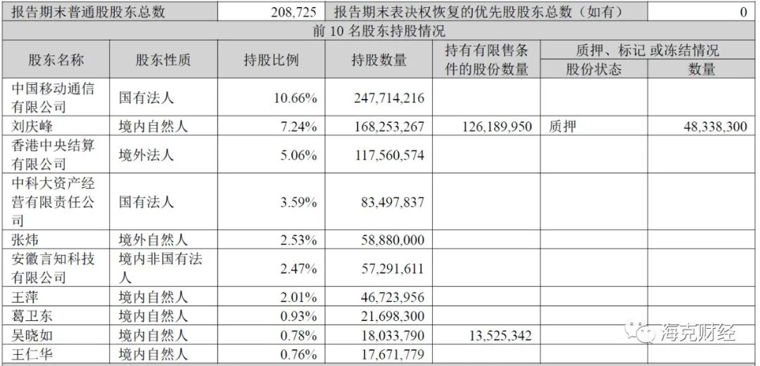 即便如此,仍有不少人对科大讯飞寄予厚望。这不仅因为其在语音和AI上有一定先发优势,更因为这家公司多少带有些国家队色彩。最新财报即2023年第一季度财报显示,国有法人中国移动通信有限公司和中科大资产经营有限责任公司在科大讯飞前十大股东中分别排在第一和第四位,持股比例分别为10.66%和3.59%,作为创始人兼董事长的刘庆峰以7.24%的持股比例位列第二。
