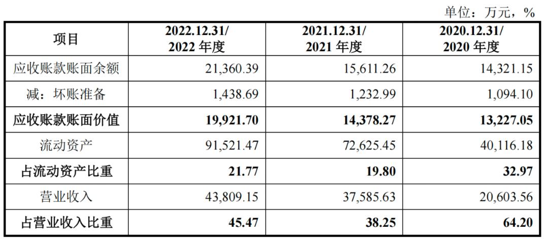 报告期内,朝微电子应收账款账面价值分别为1.32亿元、1.44亿元和1.99亿元,呈逐年走高趋势,占当期营业收入的比例分别为64.20%、38.25%和45.47%。