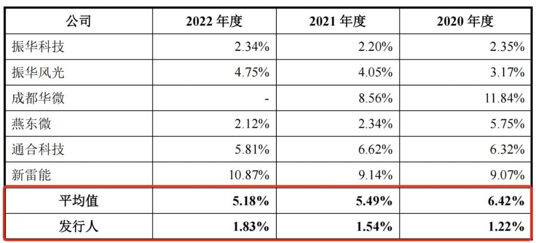 朝微电子拥有42名研发人员,占员工总人数的比例为11.02%。招股书显示,报告期内,朝微电子研发人员职工薪酬占收入比例分别为1.22%、1.54%和1.83%,而同行公司均值分别为6.42%、5.49%和5.18%。