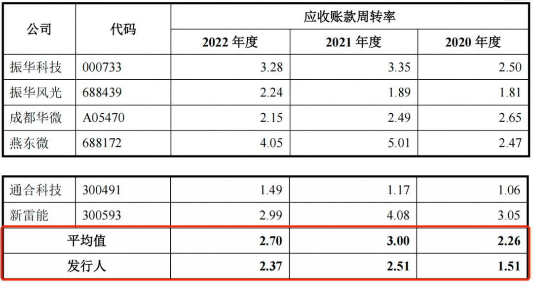 报告期内,朝微电子的应收账款周转率 (指一定时期内应收账款转化为现金的平均次数,周转率越高,表明赊账越少、收账迅速) 分别为1.51、2.51和2.37,而同行公司的应收账款周转率平均值分别为2.26、3.00和2.70。