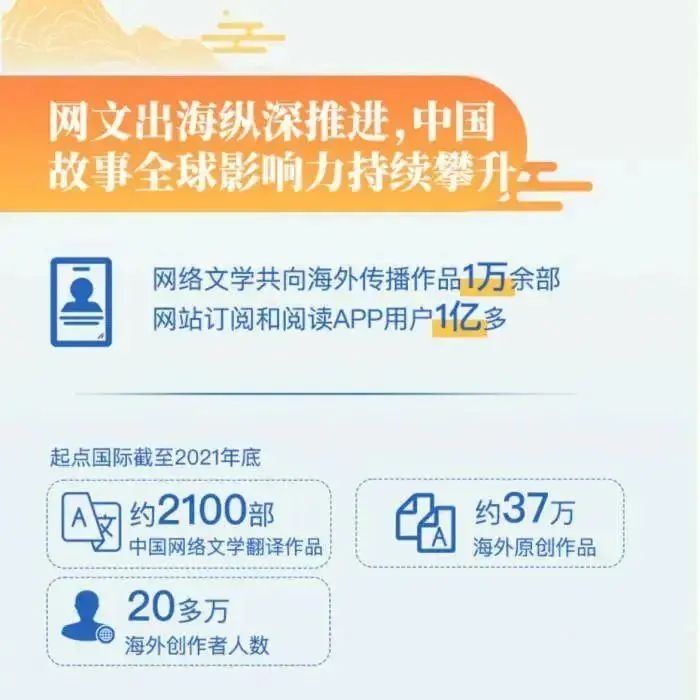 根据中国作协 2021 年公布的数据显示,中国网络文学共向海外输出网文作品 1 万多部,实体书授权超 4000 部,上线翻译作品 3000 多部。