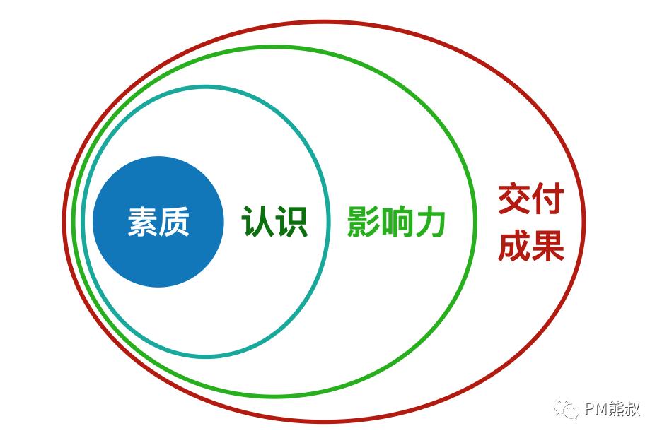 另外,从产品经理的职业能力上看,可以分成四个圈层:素质层、认知层、影响力层和交付成果层: