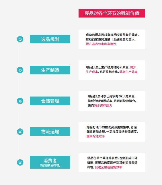 在选品规划环节,爆品为卖家提供市场指导,让卖家理解看不见摸不着的海外消费者喜好。在生产制造环节,爆品能提高生产的标准化程度,实现降本增效。在仓储物流环节,爆品打法一方面可以加速清仓,一方面可使物流资源更加集中,前后端共同作用拉高供应链周转效率。到了销售渠道终端,爆品形成的口碑可以延伸到其他消费者,辐射能量的广度和深度进一步提高。