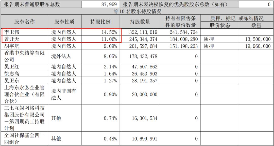 从一季报看,李卫伟和曾开天分别是三七互娱的第一第二大股东,俩人持股比例分别为14.52%和11.06%,加起来超过四分之一了 。