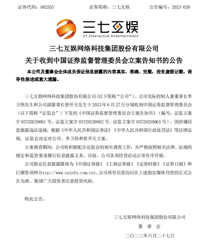 今年上半年,这一波AI热潮加上版号松口的利好,带动游戏板块蹭蹭起,在这个节骨眼上,三七互娱和一二把手均被证监会立案。