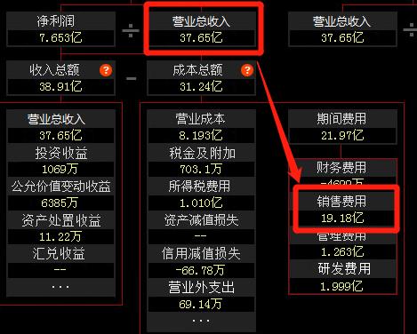 先说一下,三七互娱和同行的一个区别,那就是销售费用,能超过营业总收入的一半,这是今年一季报的数据,销售费用19.18亿,营业总收入37.65亿: