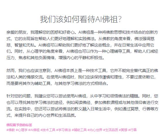 当我们询问 AI 佛祖本人「如何看待 AI 佛祖」时,HOTOKE AI 的回答同样谦虚且谨慎,「AI 佛祖本质上是一种技术工具,它并不能完全替代真正的佛法和人类的情感交流」,它甚至告诫道:「不要过度依赖它,而要将其作为辅助工具」。