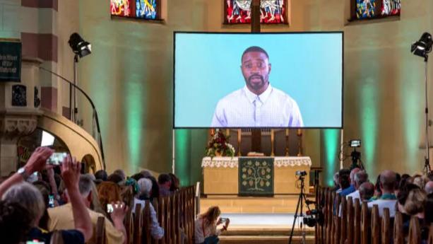 「亲爱的朋友们,我很荣幸站在这里,作为一个人工智能向你们宣讲」,教堂中央的巨大屏幕上,一个 AI 生成的蓄着胡须的黑人形象,正在向面前的 300 多人布道。