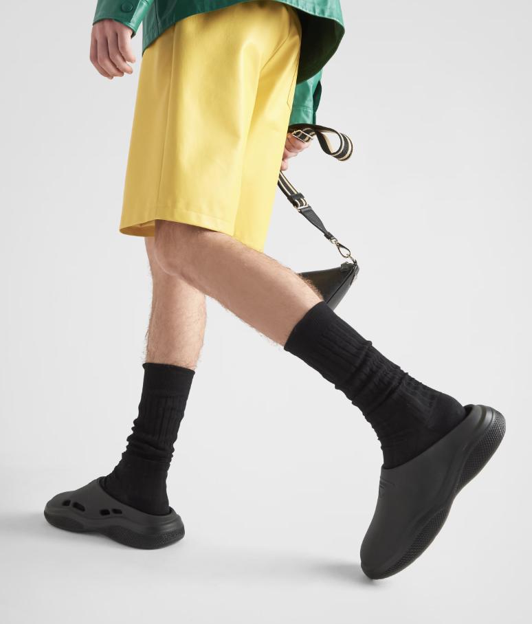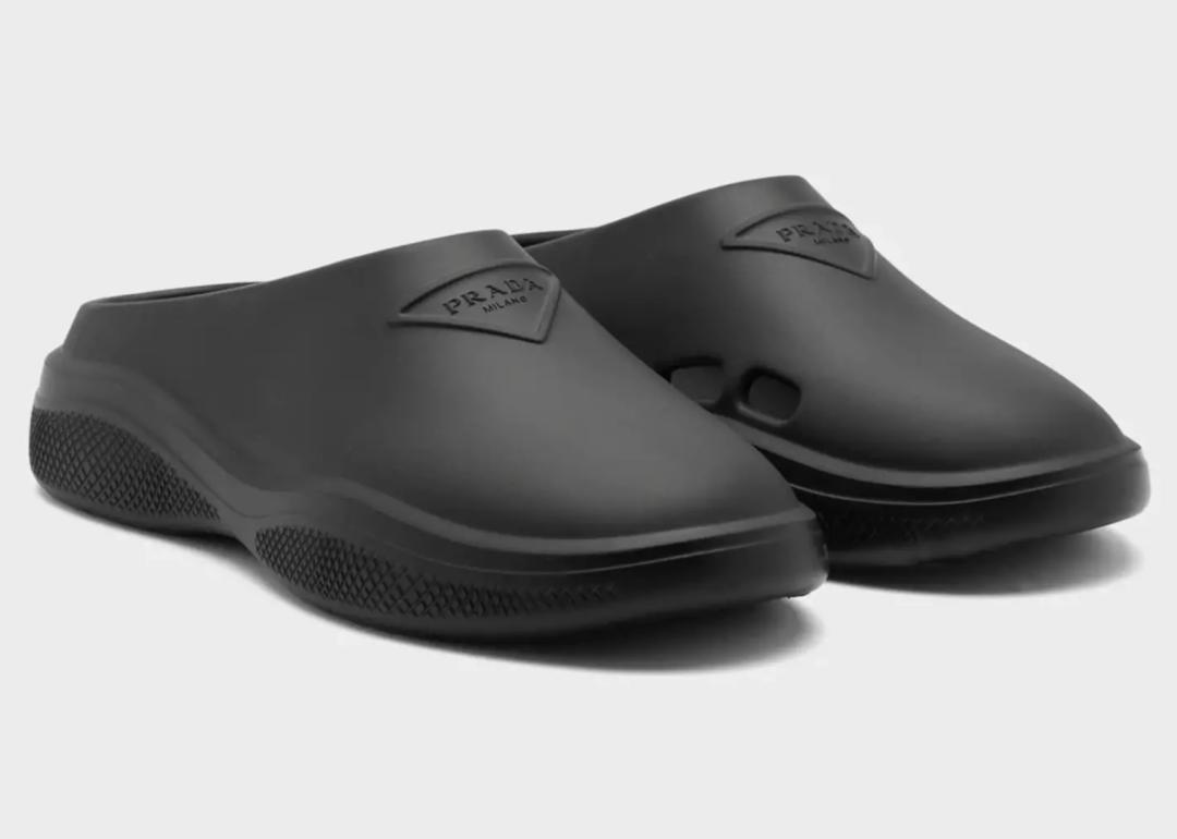 橡胶材质热度的拖鞋这两年的热度迟迟不减,选择紧跟潮流的 Prada 也推出了 Foam Rubber Mules。
