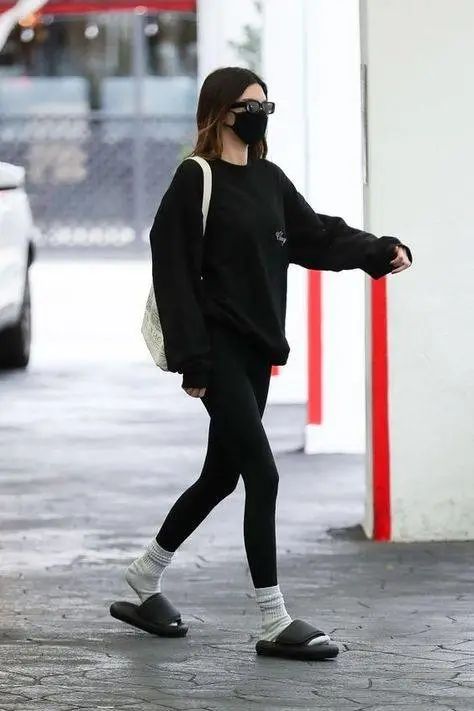 运动装和拖鞋绝配,穿着精致,同样可以用它来搭配,表达出慵懒氛围,和近几年的 Loungewear 相辅相成,容纳穿搭的更多种可能。