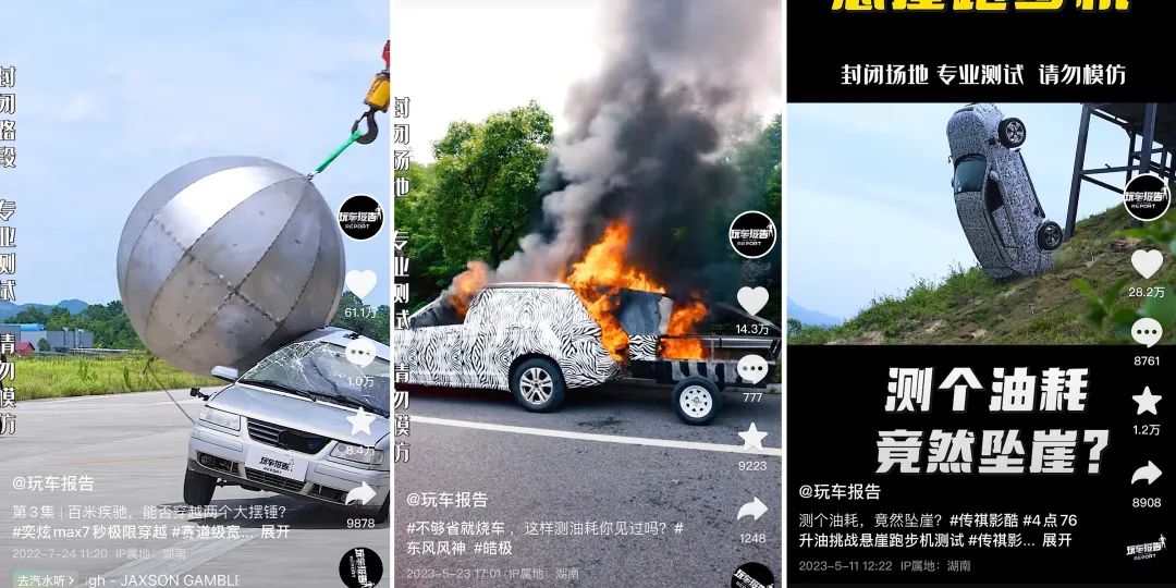 具体来看,极限测评和大事件,会由专业团队在机场赛道或专业越野场地实景拍摄,通过玩车报告科技+硬核的测评体系,针对车型进行不同的极限测评内容,由此精准而清晰地呈现出每辆车的独特性能,比如极限测油耗、不达标就烧车,用车尾撞击测试来验证高速追尾的严重性,做撞毁测评来看日系车和德系车谁更耐装等;打造出兼具曝光度和话题度的创意级大事件,最终实现广泛传播和深度种草。