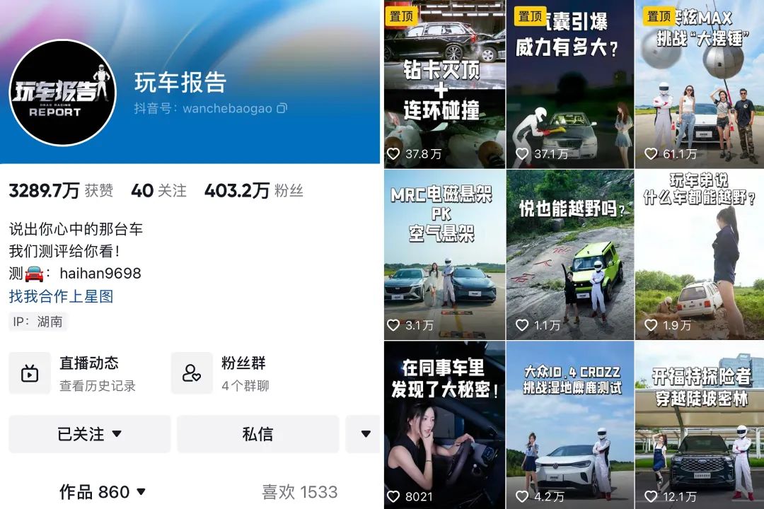 据卡思观测,@玩车报告 在抖音发布的视频作品包含了“极限测评”“大事件”“原创试驾”“情怀老车”等多个板块,在这之中,以“极限测评”和“大事件”两个内容系列最为突出。