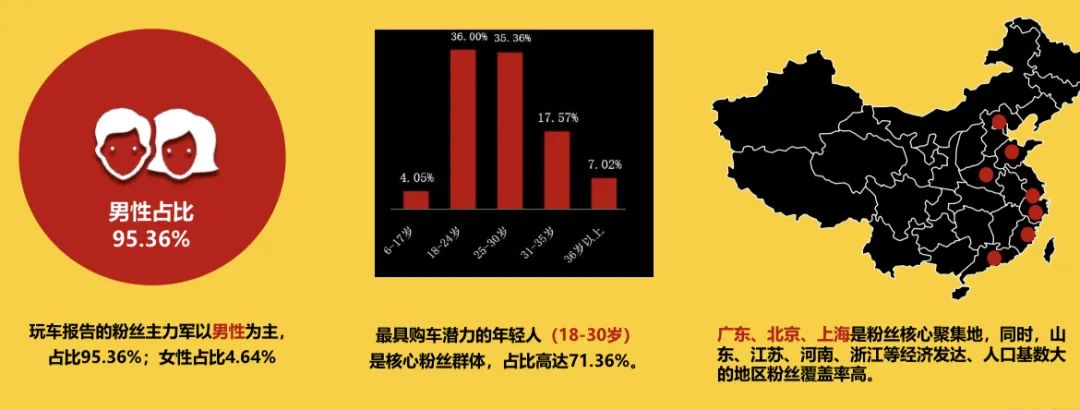 一方面,账号粉丝量不断增长,且据黄海涵透露,@玩车报告 的粉丝主力军以男性为主,占比95.36%,最具购车潜力的年轻人(18-30岁)占比高达71.36%,广东、北京、上海是粉丝核心聚集地,同时山东、江苏、河南、浙江等经济发达、人口基数大的地区粉丝覆盖率也相对更高,整体来看,出于内容的专业度,账号吸引的粉丝也更精准,也更具有商业价值。