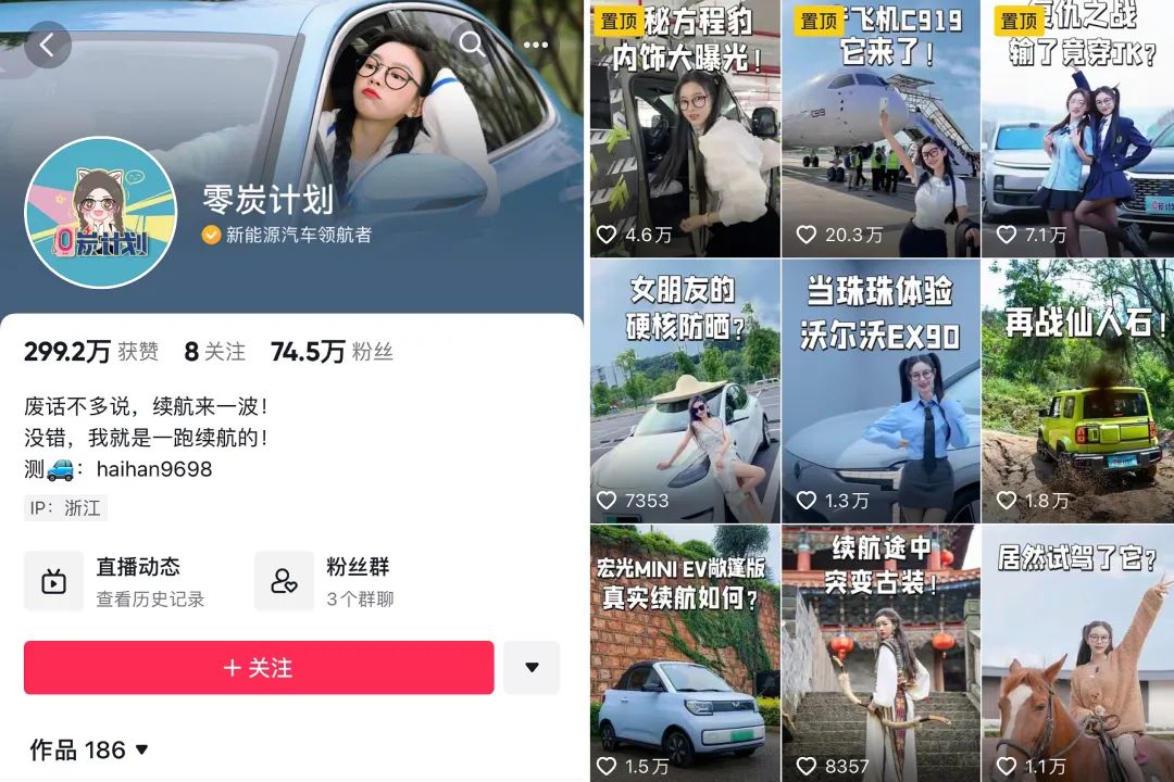 黄海涵告诉我们,@零炭计划偏向于人设起号,出境主人公珠珠青春洋溢、元气满满,在视频中的表现力更加活跃、存在感也更强。和@玩车报告 比较,这个账号更倾向于轻量化操作,主打通过有趣而有用的“测续航”内容在新能源领域跑出自己的专业影响力,账号诞生当年,便成为了2022年 懂车帝十大新能源创作者之一。目前,@零炭计划 在抖音共发布了167条作品,粉丝量已稳步增长至74.5W。
