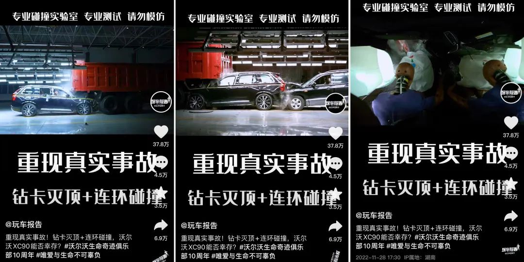 与之相对应,作品的各项数据表现也非常可观,且经常会有“轰动型”视频诞生。比如2022年11月28日,@玩车报告发布的沃尔沃XC90“车祸复刻”行动,通过实景拍摄深度还原了火车削顶+连环追尾、侧翻压顶两大严重事故场景,紧张的氛围和真实的画面不仅能让用户有身临其境的代入感,汽车的性能也在这样的“死亡”测验中得到了验证。这条视频累积播放量达到5500W+,其中钻卡削顶碰撞测试在抖音的播放量超过1250W,点赞量则达到了37W。