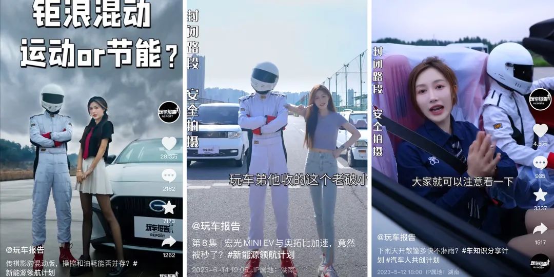 不同内容板块下发布的一系列作品,均强调专业、真实,能带给用户可靠且有意义的参考。与此同时,在其发布的视频中,我们会看到两个形象鲜明的固定IP人物,一位是身穿白色赛车服、头戴深色面罩赛车头盔且车技过人、拥有丰富汽车专业知识的神秘人“玩车弟”,另一位则是活泼靓丽、擅长烘托气氛,且有胆量和玩车弟一起参与各种极限测评的“玩车妹”小橙,两个人一冷一热,密切配合,一起带领用户见证着每一次极限测评,在专业性之余,又补足了视频的趣味性、加深了用户的记忆点,