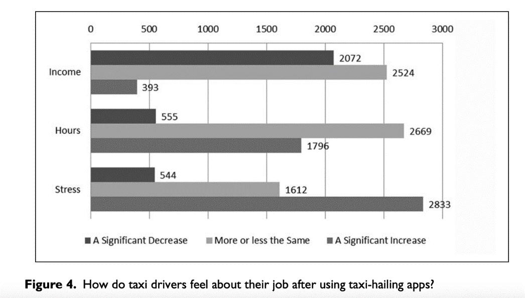 多伦多大学信息学院助理教授陈玉洁对4989位曾开过出租车的滴滴司机进行问卷调查后发现,一半以上的司机认为入驻滴滴后压力大增,约五分之二的人认为收入比开出租车时少多了。大量私家车涌入市场是收入减少的主要原因。|Thrown under the bus and outrunning it! The logic of Didi and taxi drivers’labour and activism in the on-demand economy