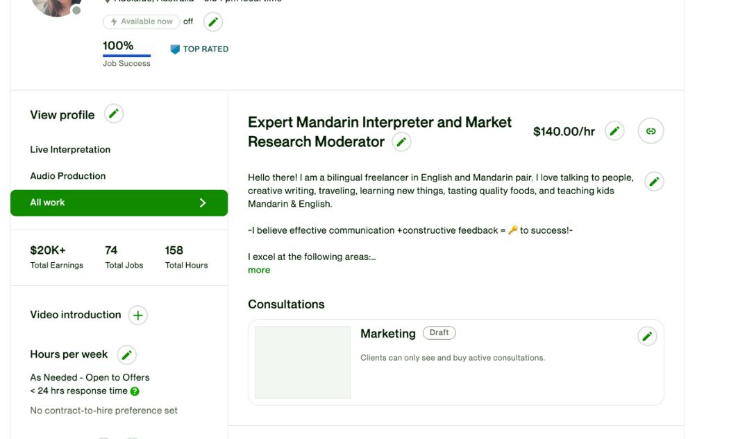 卓卓的Upwork页面。如今卓卓给自己定的时薪是140美元,她一天工作三四个小时,其余时间自由支配。|受访者提供