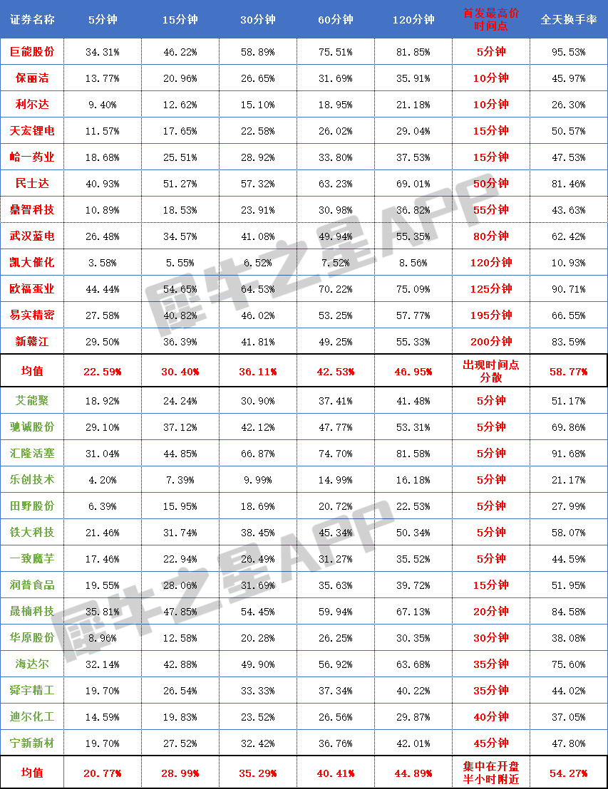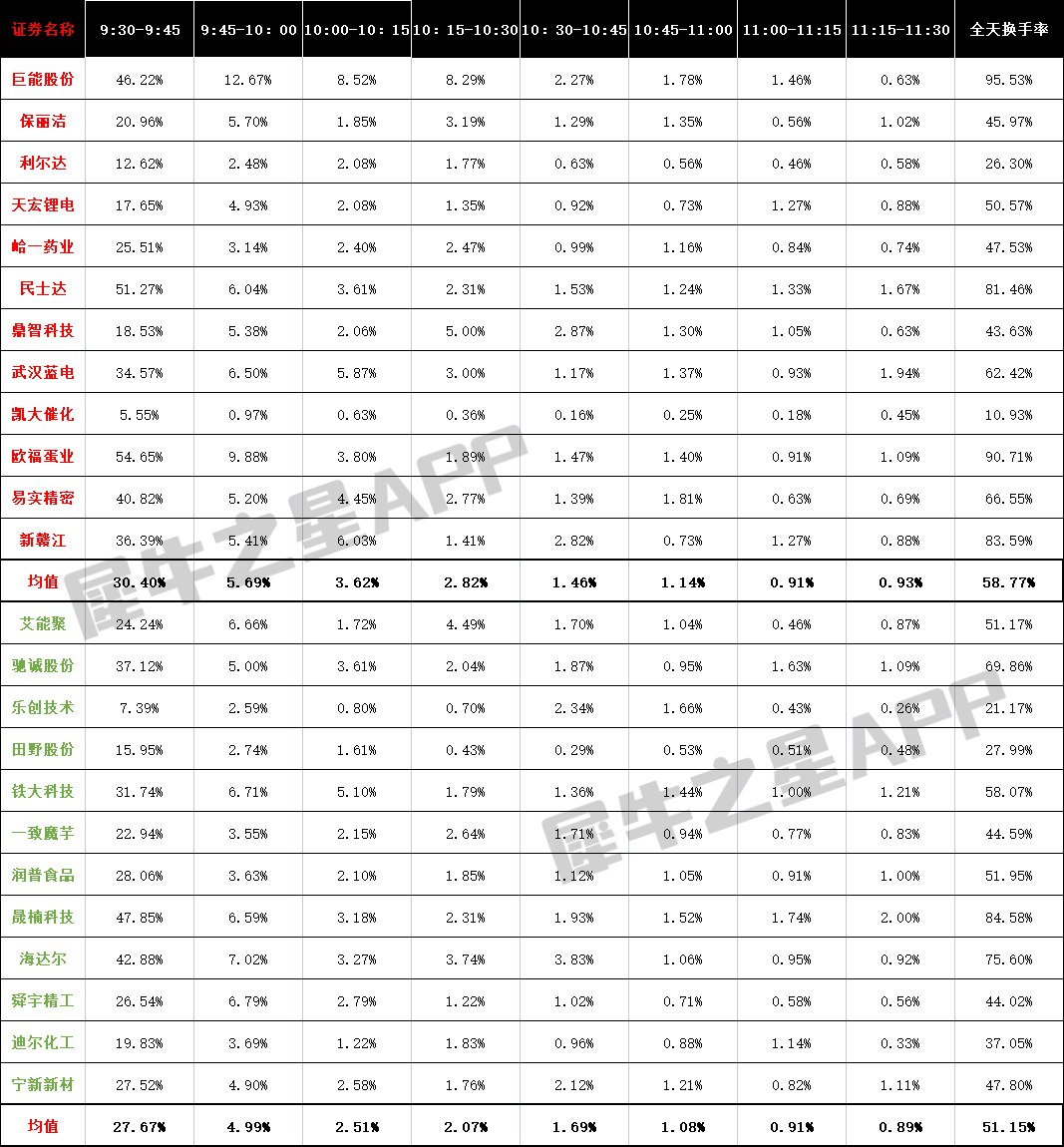 另外,在对比分析了5、15、30、60、120等不同时间段的换手率变化情况后,我们以15分为刻度,总结了26家个股的早盘分时数据:
