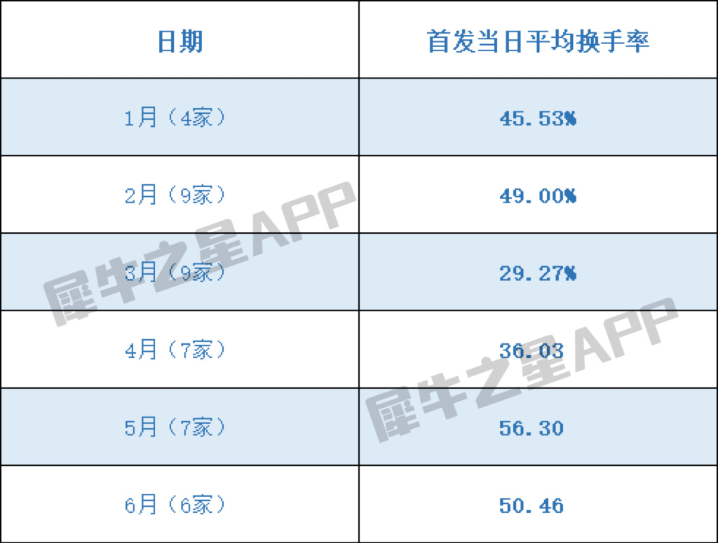 除了破发率比较低以外,这批新股的换手率表现也比去年的35%左右的平均值高出不少,近半年新股上市当日的换手率为44.80%。