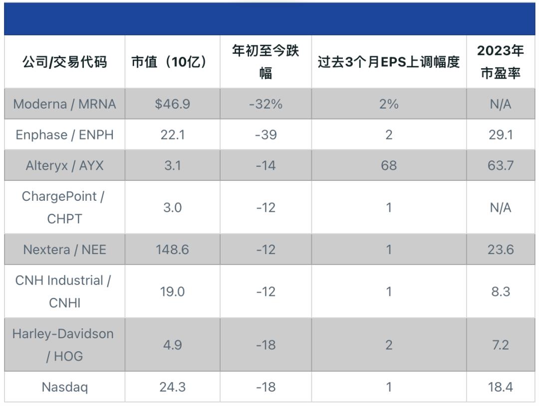 《巴伦周刊》对罗素1000指数进行了筛选,寻找盈利预期上升和股价下跌的股票。过去三个月,大约100只股票的盈利预期获得华尔街分析师的上调,而股价却出现了下跌。