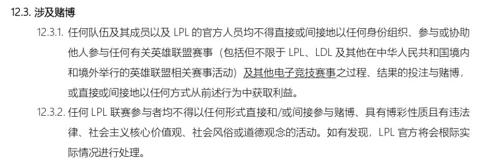 LPL官方规则中目前也规定了涉及赌博的相关内容,但在处罚明细上并没有做明确规定,只是由“LPL官方根据实际情况进行处理”。而此前S11时的假赛事件中,LPL官方给予了假赛参与人员不同程度的禁赛处罚,其中处于舆论中心的Bo选手被处以四个月禁赛处罚引起了不少观众的不满。