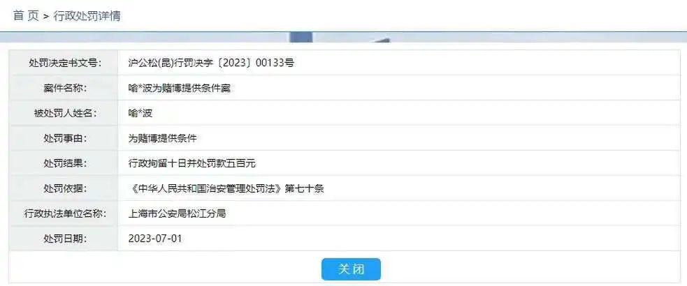 与此同时,网上开始流传一张上海松江公安公示的行政处罚详情图,案件名称为“喻X波为赌博提供条件案”。由于松江公安公布的信息中并不会显示全名,因此不少网友便结合LPL推迟开票疑似要调整赛程的举动,迅速将该行政处罚人员和滔搏俱乐部ADC选手喻文波(游戏ID:JackeyLove)联系在了一起。