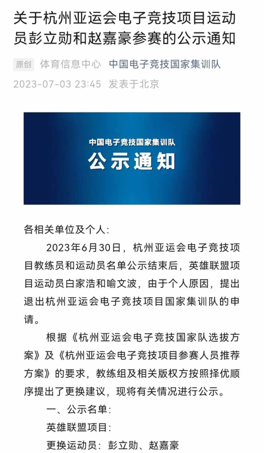 谁曾想一波三折后仍未到尾声。7月3日晚23时45分,中国电子竞技国家集训队发布通知,英雄联盟项目运动员白家浩(游戏ID:369)和喻文波由于个人原因提出退出杭州亚运会电子竞技项目国家集训队的申请,英雄联盟项目更换运动员彭立勋(游戏ID:Xun)和赵嘉豪(游戏ID:Elk)。