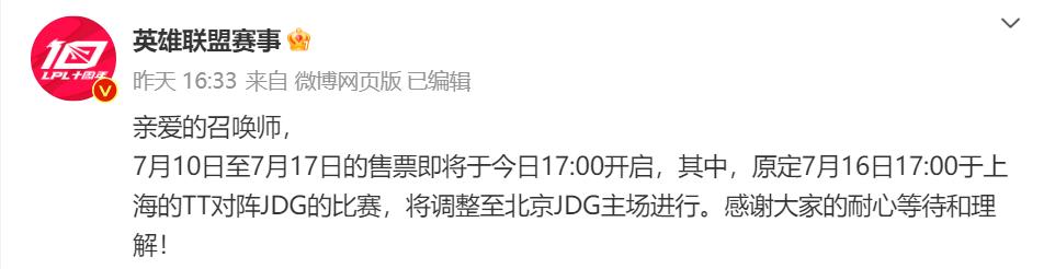 眼看当天的LPL常规赛快要开赛,英雄联盟赛事官方发布公告表示售票将于当日17时开启,而推迟开票的主要原因是将与原定于7月16日JDG对阵TT的比赛从上海主场调整至了北京JDG主场进行。