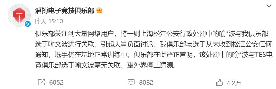 滔搏官方动作也比较迅速,三点时就发出公告表示并未收到松江公安任何通知,并表示处罚中的喻X波与滔搏电竞俱乐部选手喻文波毫无关联。