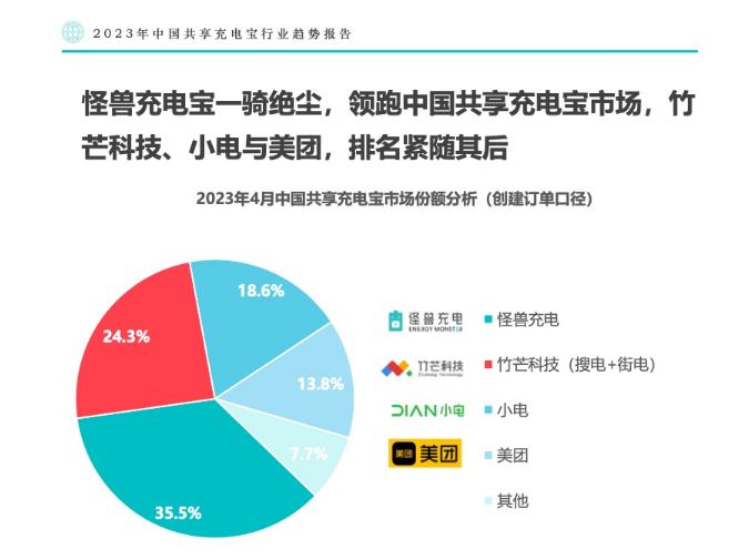 据 Fastdata极数发布的《2023年中国共享充电宝行业趋势报告》显示,今年4月国内共享充电宝市场份额(创建订单口径)排在前四位的玩家分别为怪兽充电、竹芒科技、小电、美团,前述四个品牌的市场份额分别为35.5%、24.3%、18.6%、13.8%,而品胜推出的共享充电宝品牌闪葱并未排在榜单前列。