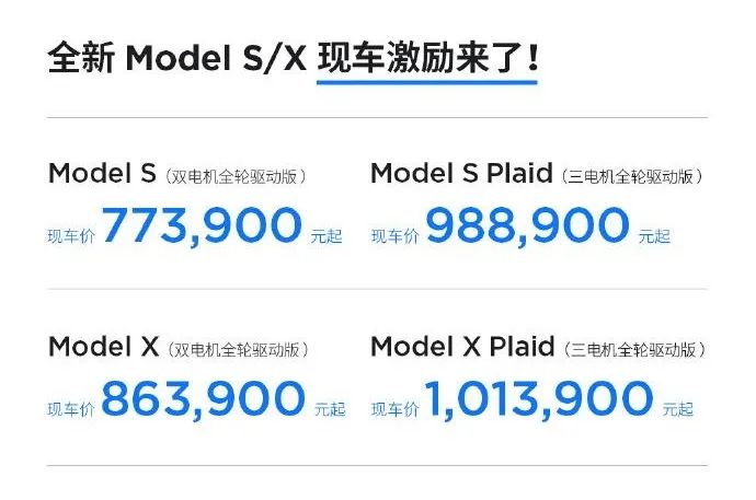 计入优惠后,Model S双电机全轮驱动版77.39万元起售,Model S Plaid三电机全轮驱动版98.89万元起售;Model X双电机全轮驱动版86.39万元起售,Model X Plaid三电机全轮驱动版101.39万元起售。