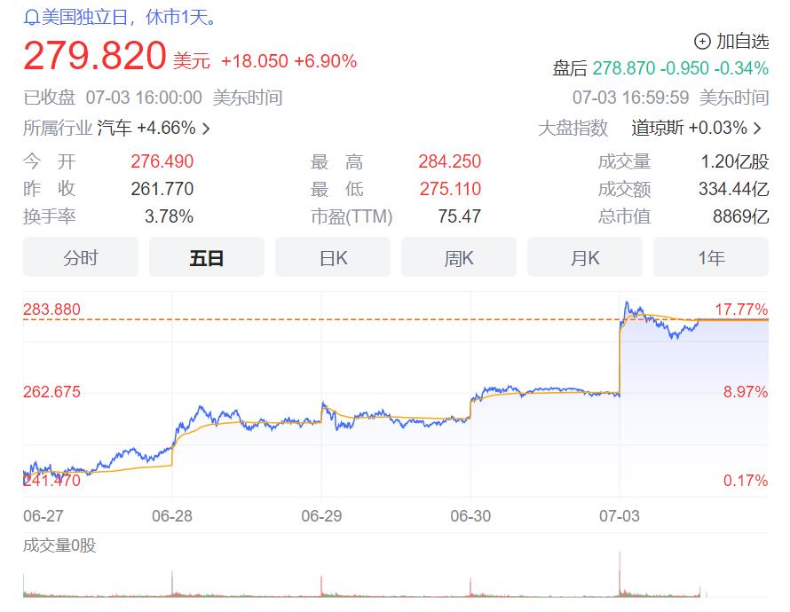 没有太多意外,经历又一夜大涨,特斯拉股价来到279.820美元,总市值也回暖到8869亿美元。