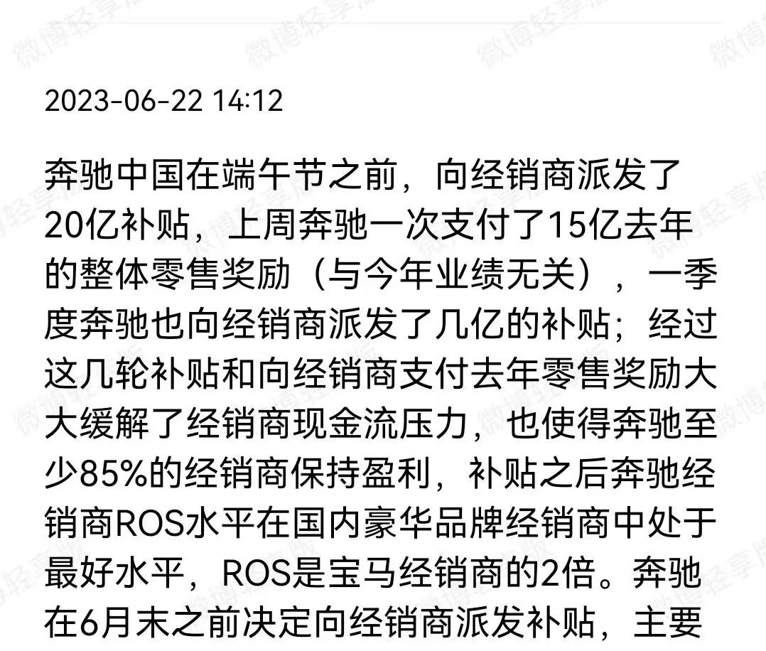端午假期前夕,奔驰中国向国内所有经销商发放了20亿元的补贴。而在此之前,奔驰刚刚一次性支付了2022年的整体零售奖励约15亿元。再将时间往前拨,一季度奔驰也向经销商发放了几亿元的补贴。