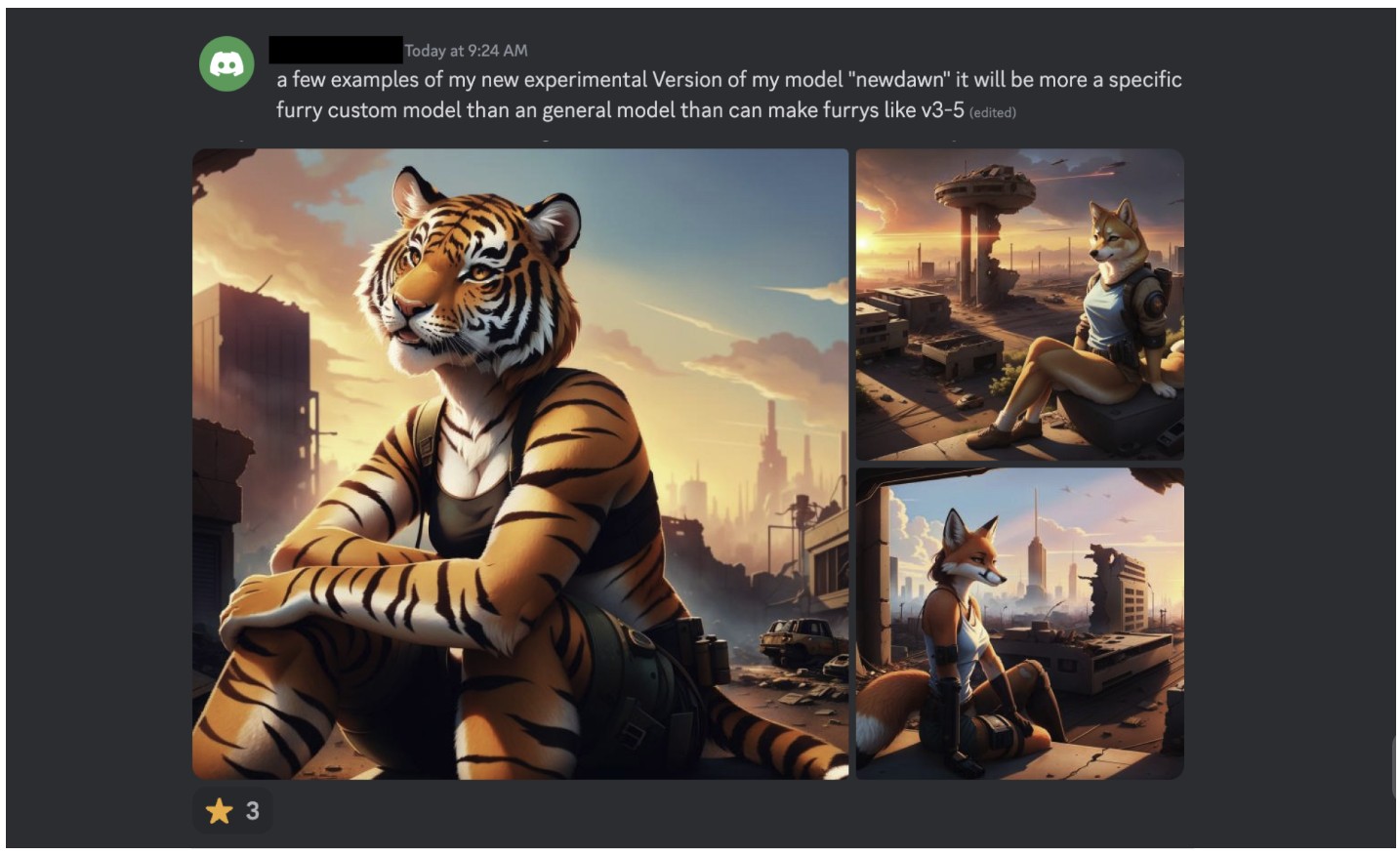 这些图像模型可以根据几乎任何兴趣来定制生成图像。Discord 频道 Furry Diffusion 中的一位用户就在对模型进行微调的基础上,生成了一个毛茸茸的图像。图片来源:Discord