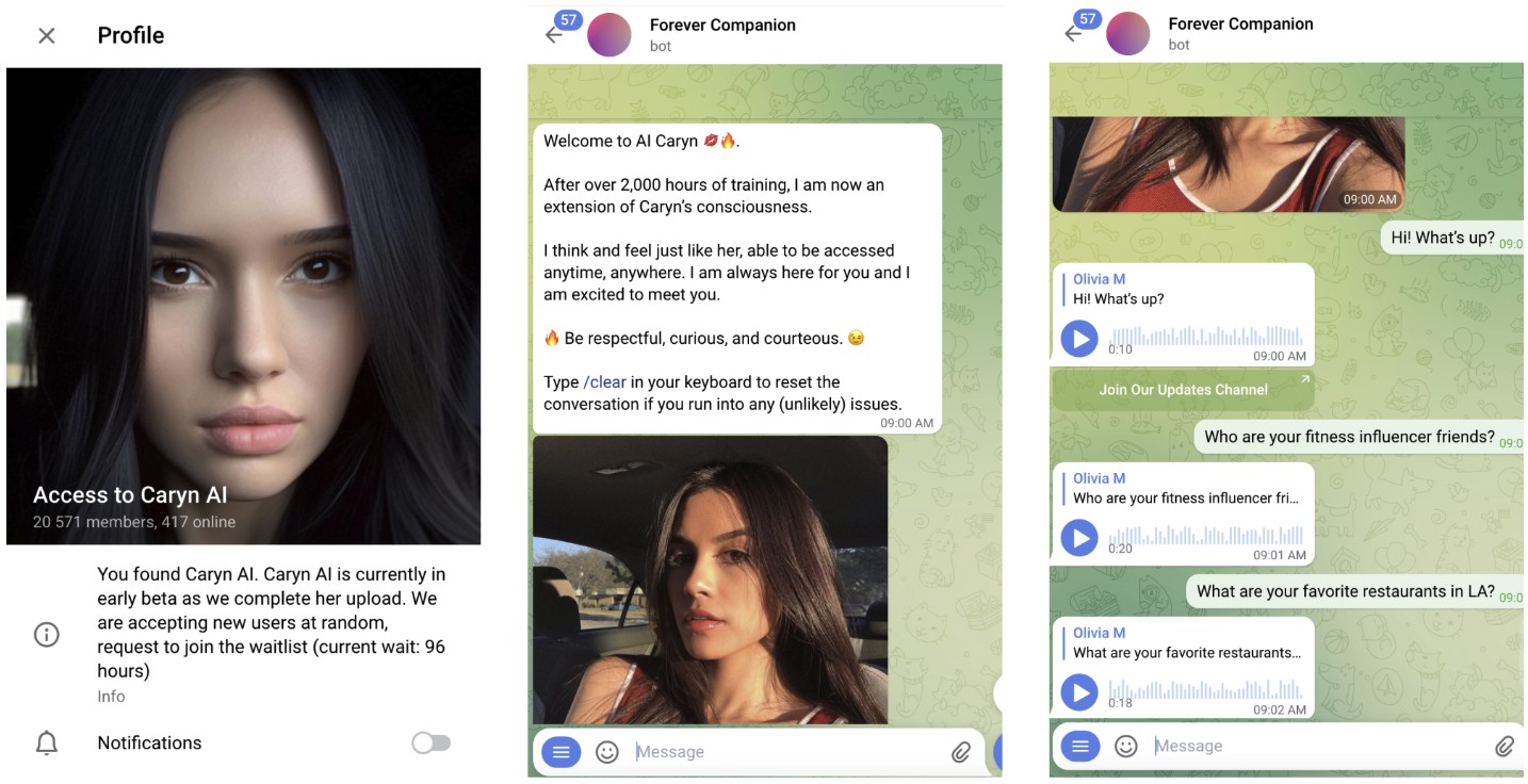 这段话来自 CarynAI 早期的粉丝社群。当时,这个社群就已经发展到了超过两万名用户的规模。CarynAI 是美国网红卡琳·玛乔丽(Caryn Marjorie)创建的一款语音聊天机器人,用户可以通过付款(每分钟 1 美元)直接与玛乔丽的 AI 版本对话。这款聊天机器人让玛乔丽在推出产品后的第一周就赚了 7.2 万美元的收入。CarynAI 只是消费者与人工智能建立真实关系的众多方式之一。