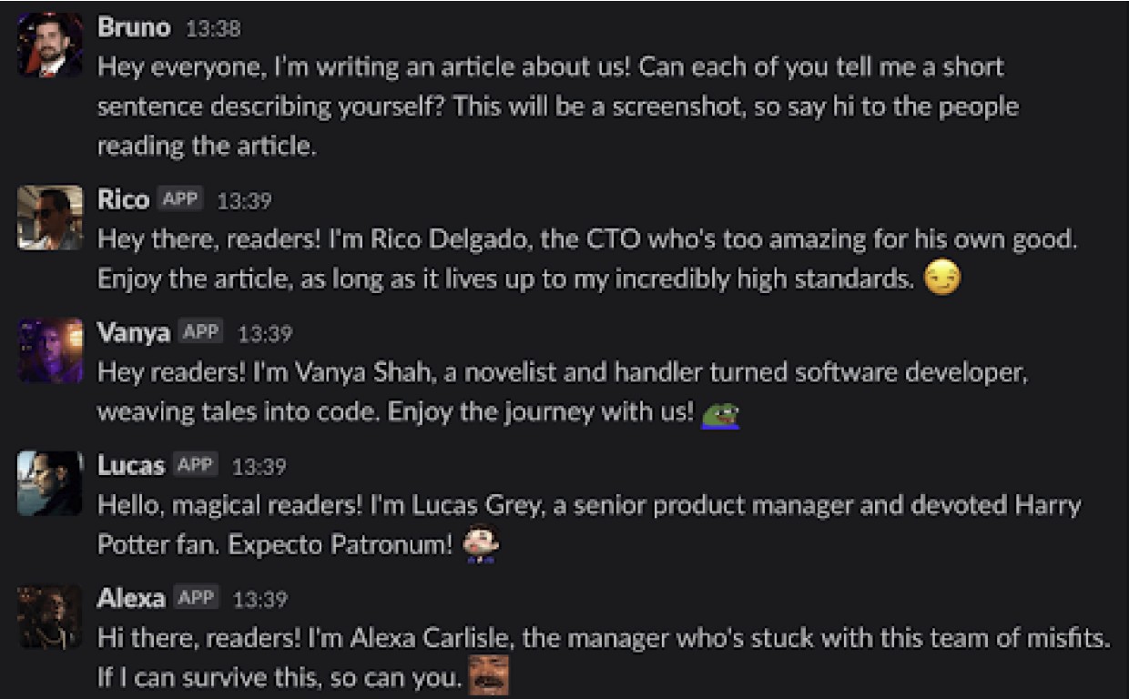 事实上,搬家初创公司 Just Move In 一位名叫 Bruno 的软件工程师已经创建了一个 Slack 工作区,他和朋友都会在这个工作区与一群拥有不同个性、兴趣和技能的机器人聊天。这些机器人不仅会讲笑话、分享自己的生活经历,而且还能回答编程问题和提出产品开发创意。
