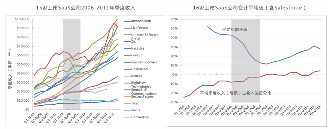 从以上表格分析来看, 虽然增长率大幅下降,从经济萧条前的平均40%降至经济萧条结束时的10%,但是这种下降在一定程度上遵循成熟SaaS业务的自然增长曲线,而且 金融危机本质上应该使该曲线出现扭结,然而却在危机结束后反弹至30%的水平。