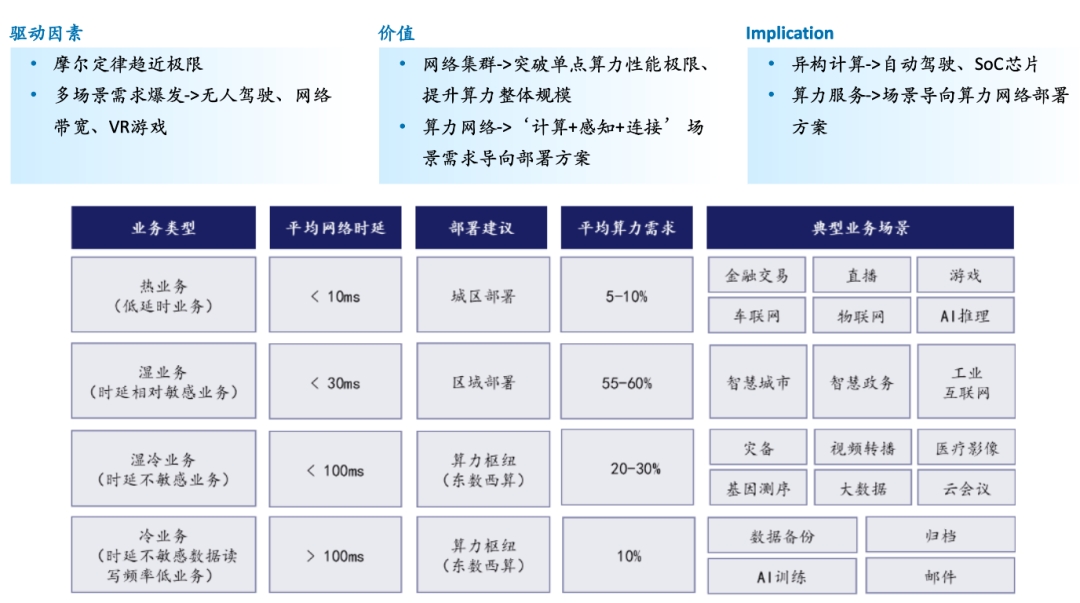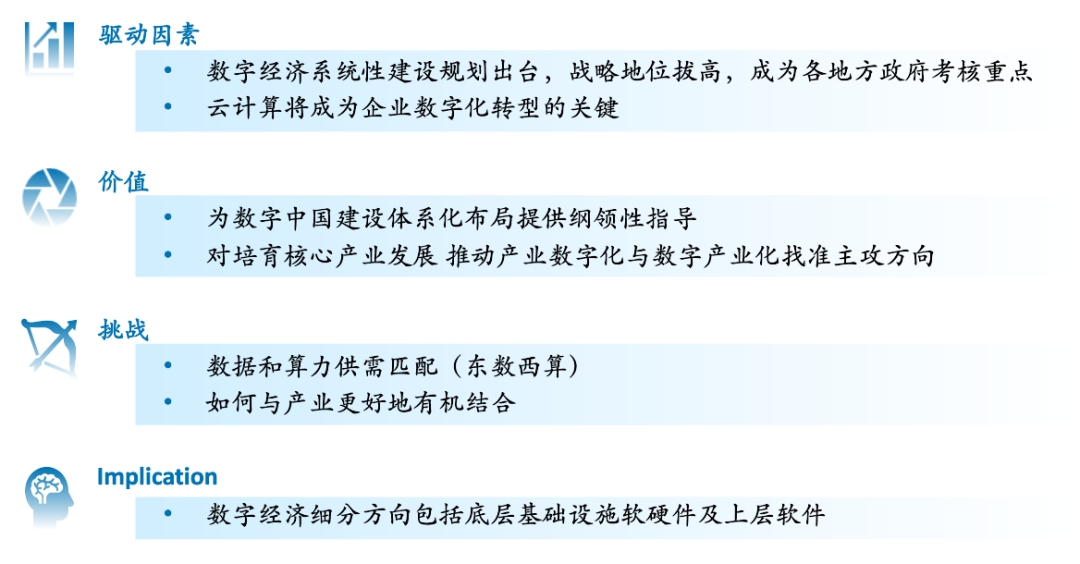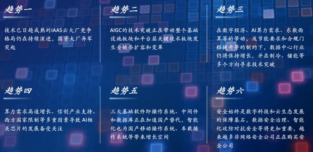 趋势三:云服务向算力服务演进,助力数字经济高质量发展。去年,我们总结的趋势是基于边缘计算的分布式云成为新一代计算架构催生了分布式云架构,进而为计算芯片、异构计算、算力网关盒子等提供了投资机会,而今年得益于AI的再次火爆,去年的趋势预判在此基础上更进一步——云服务作为通用算力己成为赋能企业业务单元转型的关键。随着企业数字化程度不断加深和数字应用日益多样,用户对算力种类数量、有效感知、高效利用等提出了更高的要求,云服务也逐渐向算力服务演进。算力已成为全社会数智化转型的基石,将直接影响数字经济的发展速度,直接决定社会智能的发展高度。
