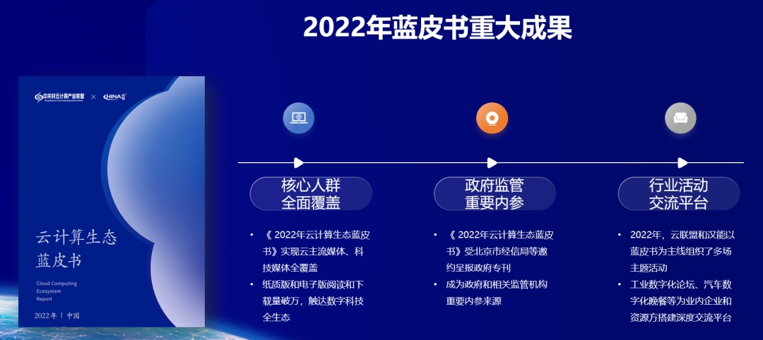 去年7月,2022年蓝皮书在全球数字经济大会上发布后,得到了行业内的认可,并受到北京市经信局等的邀约,成为呈报政府的专刊。2022年蓝皮书纸质版与电子版下载量破万,全面覆盖数字科技核心人群。自2022年蓝皮书发布后,云联盟和汉能投资以蓝皮书为主线组织了包括工业数字化论坛、汽车数字化晚宴等多场主题交流活动,成为业内企业和资源方交流的平台,深度链接数字科技各方参与者。