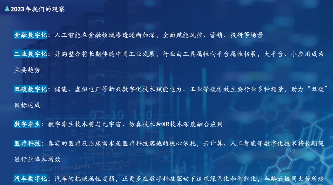 趋势七:制造业、金融业等引领传统行业数智化转型,国产替代为科技企业持续释放红利。这个变化在去年已经存在,只是今年成为主流趋势之一。