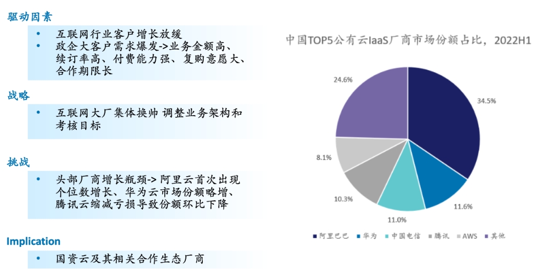趋势二:国资云提速发展,互联网云大厂调整业务战略,产品降价、冲击盈利并存。进入2022年,各大厂商由此前的“采用不同业务、生态、资本布局”到当下步调一致地调整组织架构来刺激业务发展,且随着互联网行业客户增长放缓,各大厂商将目标转移到了业务金额和续订金额高、付费能力强、复购意愿大的政企客户身上,并开始向传统行业拓展。