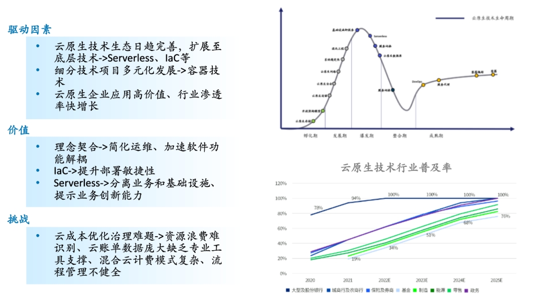 就基础设施板和平台关键层技术板块来说,行业整体发展趋势的观察比去年更加地深入与细致。去年的大趋势是:云厂商集中度提升,细分玩家产品化、精细化和生态化发展,而今年则更多地聚焦在新技术的变革给行业带来的发展机会和增长方向,具体来说则是: