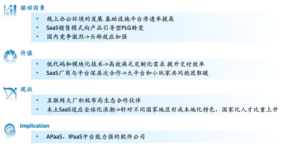 其次,在工业数字化赛道:去年提及的数字化成为成熟工业的下一个竞争点已成事实,未来并购整合成为长期趋势,行业发展由工具属性向平台属性拓展,大平台、小应用成为主要趋势。